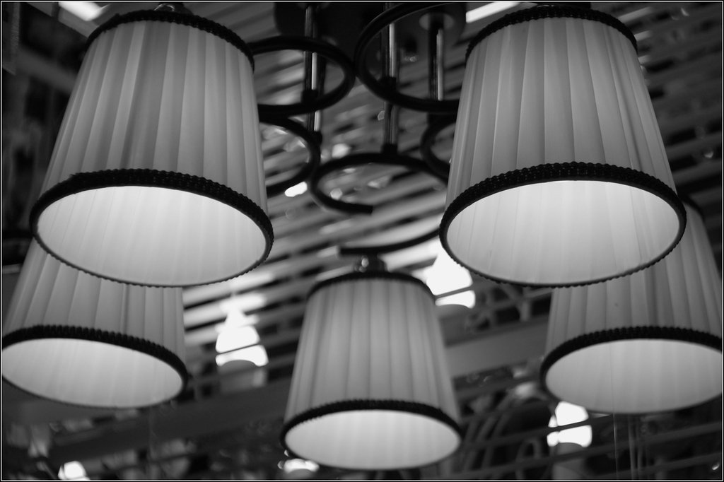 В общем, ища источники света ради пузыриков, пощелкала в магазине витрину с люстрами. Пузырики, в основном, не получились, поэтому большую часть кадров удалила. Но парочка чем-то зацепила (ритмичным контрастом, что ли) и я решила перевести их в чб - посмотреть, что получится. И вот тут показалось, что картинка выглядит какой-то непривычно не цифровой...