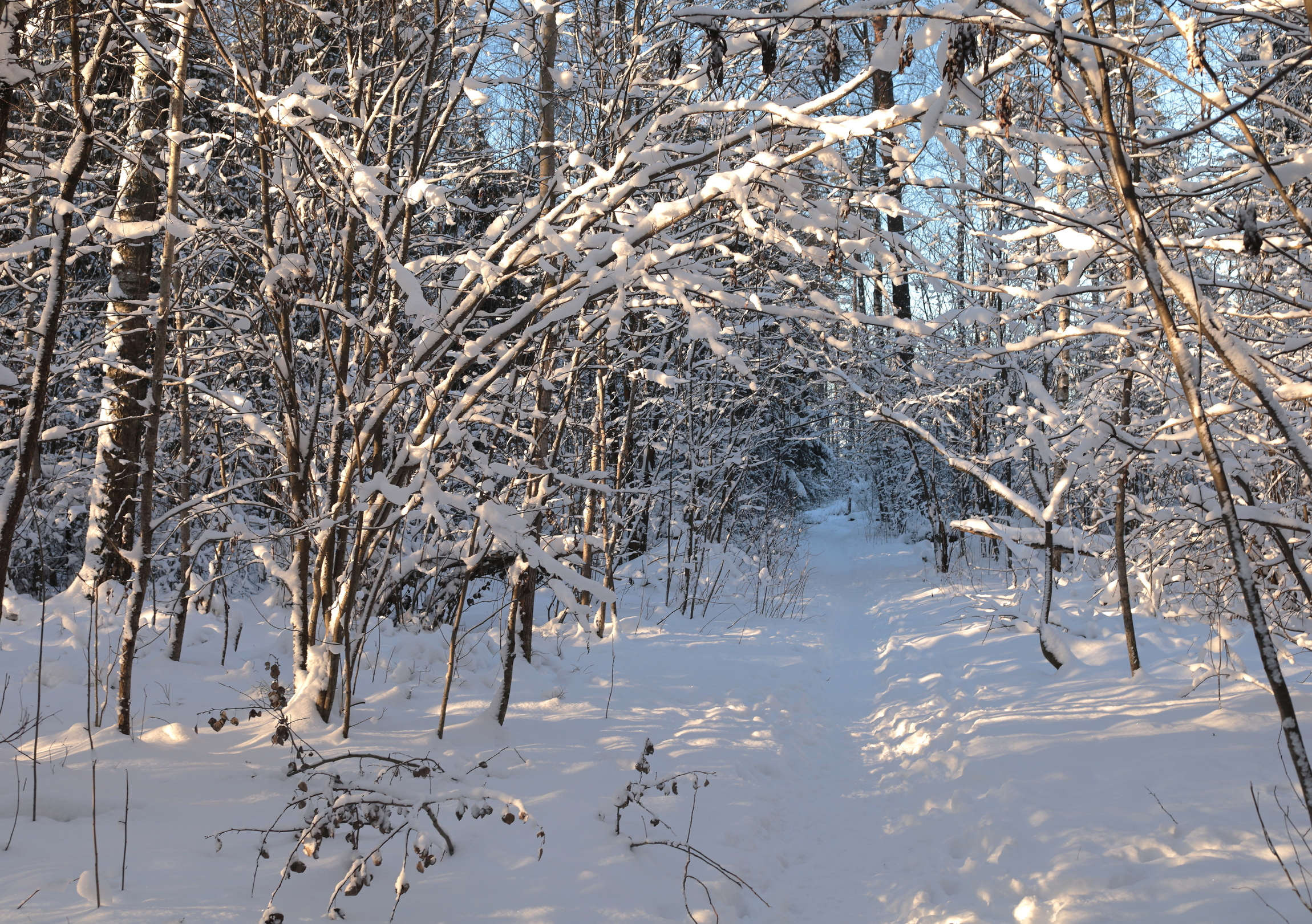 Вот с этим обычным фото помучился как будто шедевр какой. А суть затыка - в цвете. Вот этот цвет - практически как камера сняла. Голубые снега и все такое.. Но глаз то у нас снег видит белым, даже и в солнечный день... Хотя и понятно, что так в природе устроено, что в тени фотик покажет голубой снег при наличии голубого неба... Пытался приводить снег к белому цвету, вот и вроде нормально, как положено - снег белый, небо голубое, но посмотришь-посмотришь - и не нравится... промежуточные варианты (слегка голубоватый) - тоже не айс... В результате - вернулся к тому, что было...