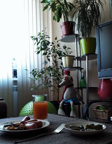Имеются все ингредиенты: книжки всякие, светильник девственного цвета, мещанский фикус или как там его как олицетворение леопардовости, вместо яблока