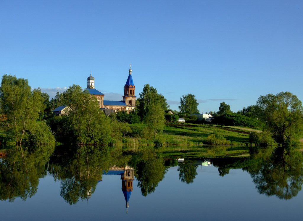 Значит эту точку на карандаш. Проверить надо при случае. Походить влево/вправо, чтобы церковь в просвет между деревьев попадала и домики красиво смотрелись. Ну и отражение тоже. Несколько вариантов ловим.