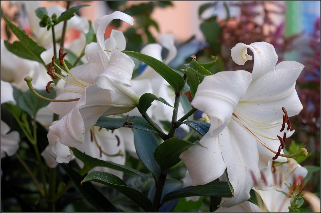 пульверизаторы, водные капли выгодно освежают цветы и придают насыщенности зелени.