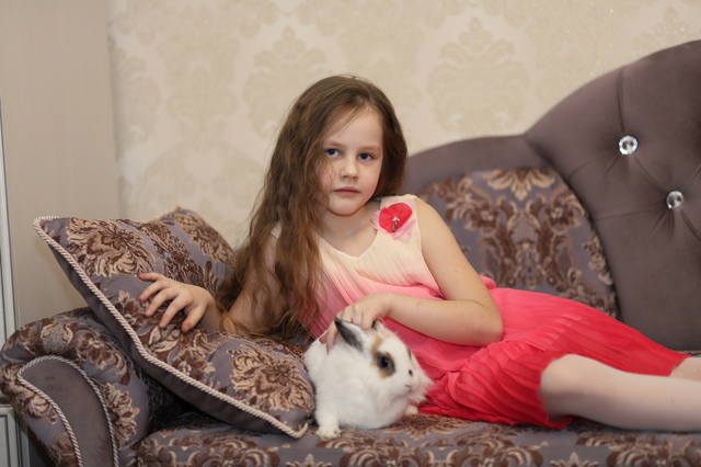 как по мне, поза норм, только образ не тот создаётся- диван, обои. здесь-бы к примеру, на фоне леса, зелени (не на диване), и по цвету с красным было бы гораздо лучше (плюс в волосы можно какие-то красные цветы для рифмы). хотя бы образ маленькой лесной феи (с кроликом всёж), банально, но всё-же.