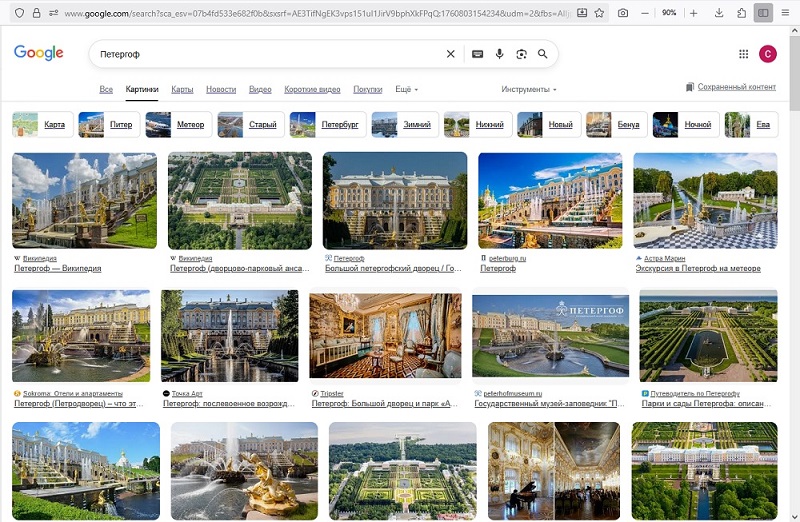 Если вы попросите гугль показать фотки с Петергофом, то посмотрите, что он вам покажет: