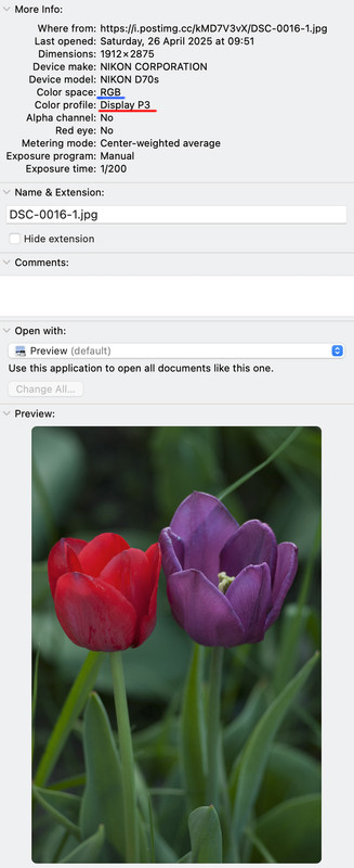 Если что, могу ещё выложить скриншот, где будет черным по белому написано: Display P3 внутри файла.