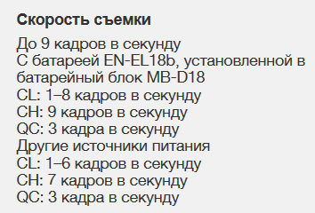 Но нужно уточнять на какой батарейке обеспечивается 9 к/с. И вот если для 9 к/с нужна другая батарейка (например, от D5) то для ее установки в бат. блок может понадобиться какая-нибудь приблуда которой в комплекте уже не будет. Так было с Д700: вроде там есть 8 к/с, но только на батарее Д3 или на 8-ми АА, но не на любых, а на высокой мощности типа Енелупа.Подробнее
