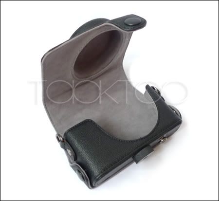 2. Дермантиновый китайский аналог фирменного - стоит дёшево (~$15), требует изъястия для зарядки и т.п., требует снятия верхней части для съёмки. Большеват, тяжеловат. Но защищает от ударов, можно крышку линзы не носить.