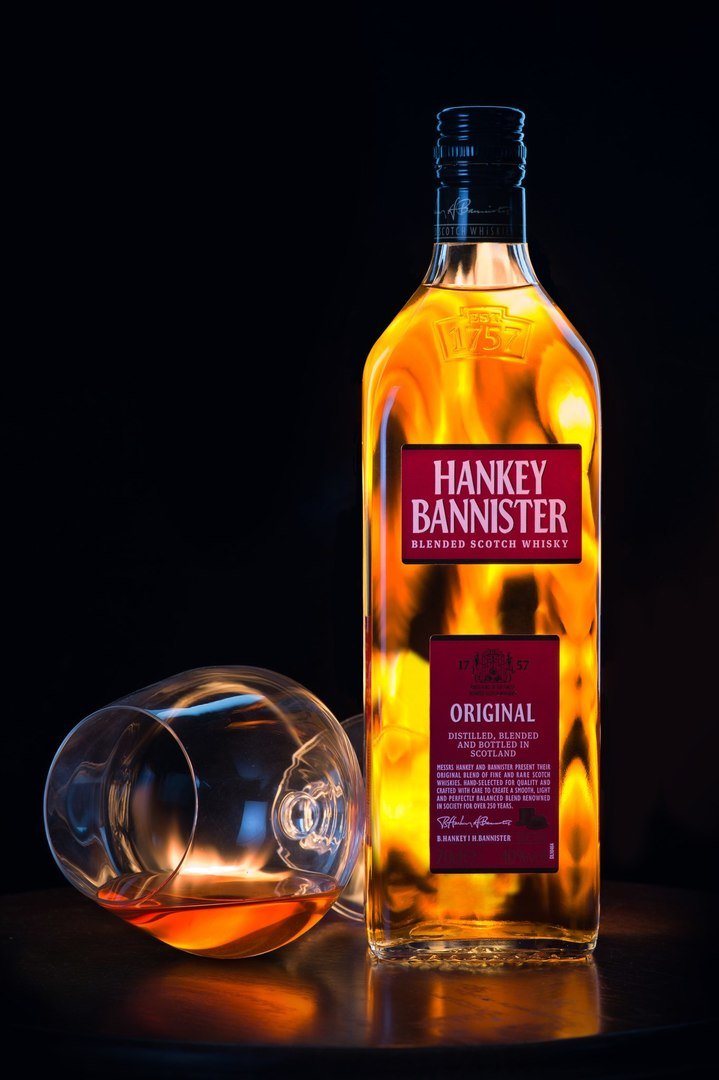 Вспышка, предназначенная для освещения передней части этикетки, стоит на полу под бутылкой и на отражатель светит через рефлектор типа "горшок". Пробовал без него — получаются лишние тени и блики от слишком широкого угла освещения.