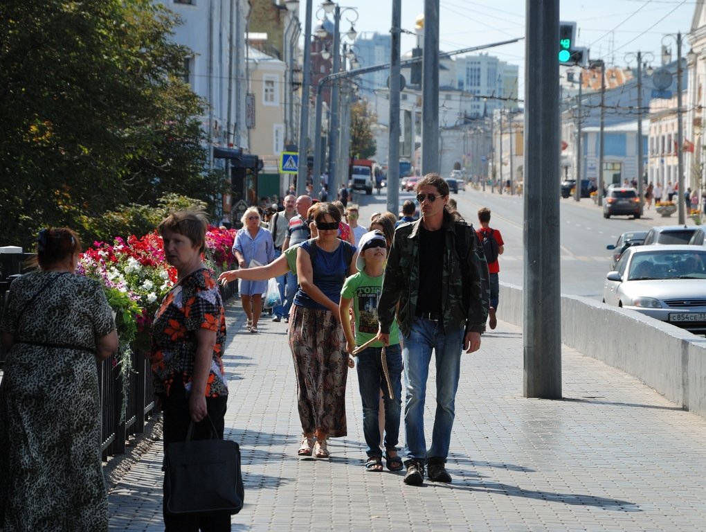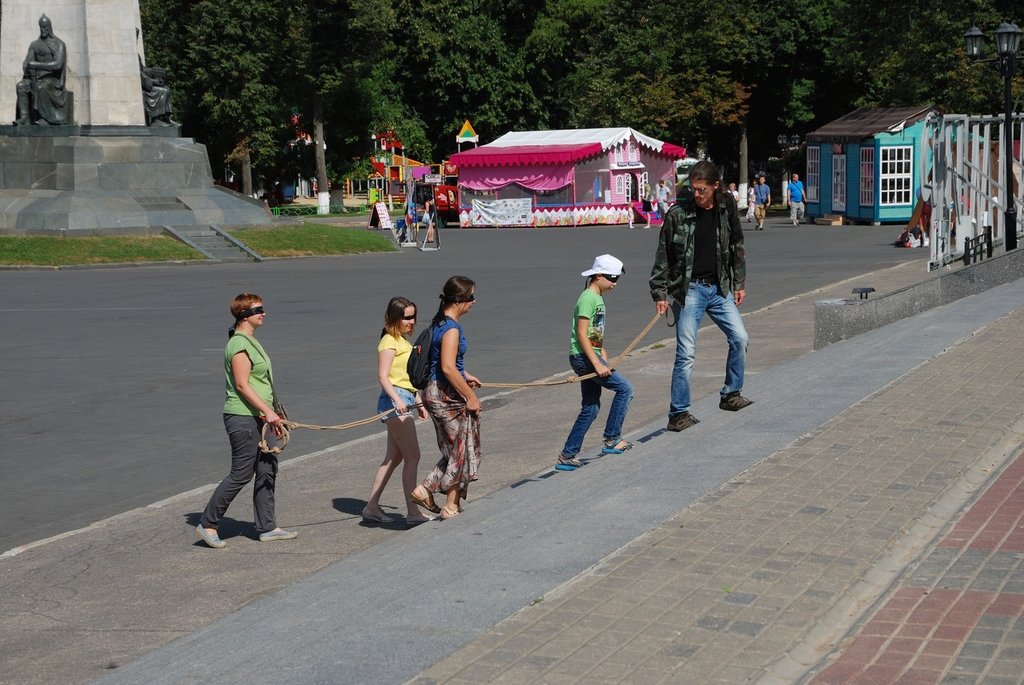 Они зрячие. Мальчишка несколько раз пытался приподнять повязку. Видимо действительно что-то типа акции в поддержку слепых. Я не спросил, ограничился фотографированием со стороны.