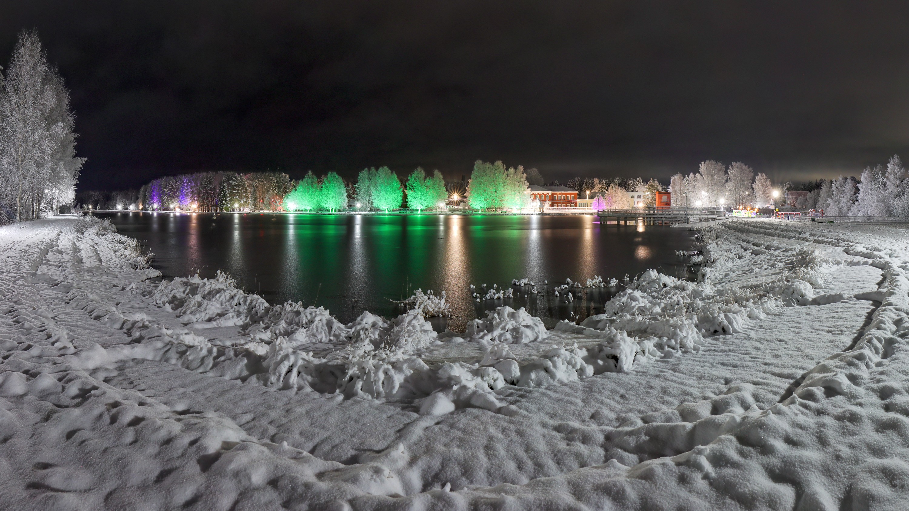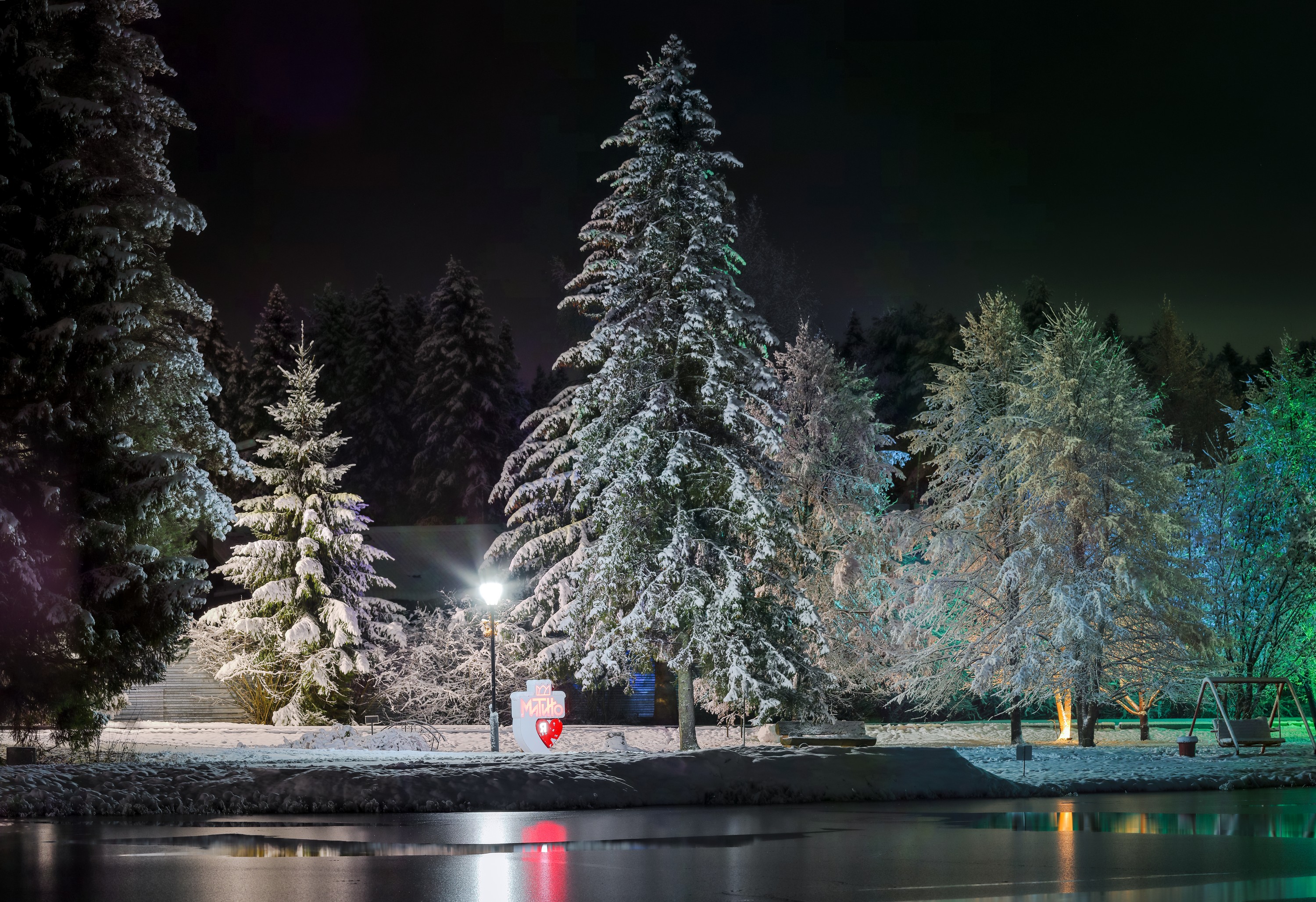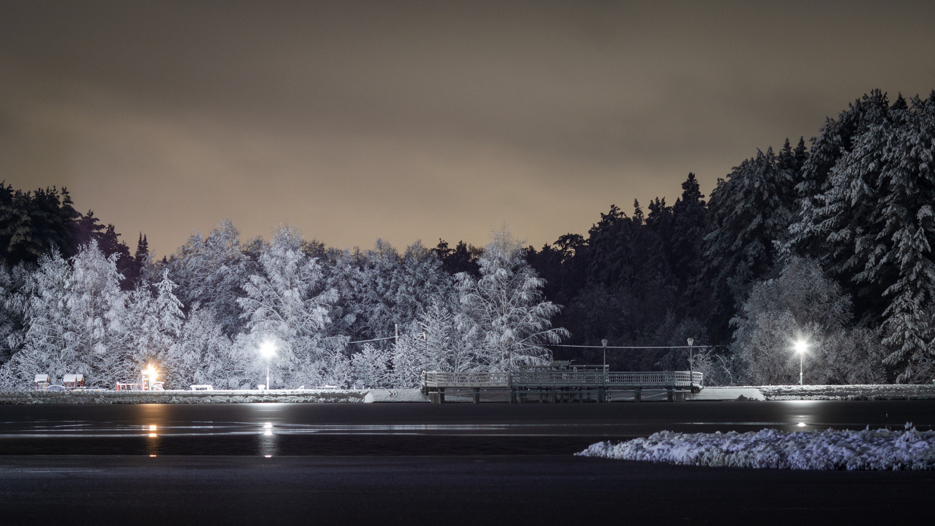Панорамы тоже очень нравится снимать. Нас тут снежком присыпало в субботу. Не удержался, сходил посреди ночи на пруд.