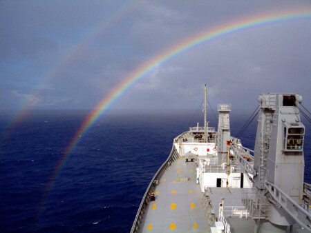 Снято в июне. Воздух уже тёплый, водичка пока холодная, отсюда - сверхрефракция (мираж). Слева паром из Хельсинки, справа - танкер из Новоталлинского порта. Мы и белый пароходик идем на Питер.
